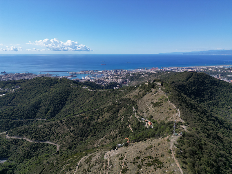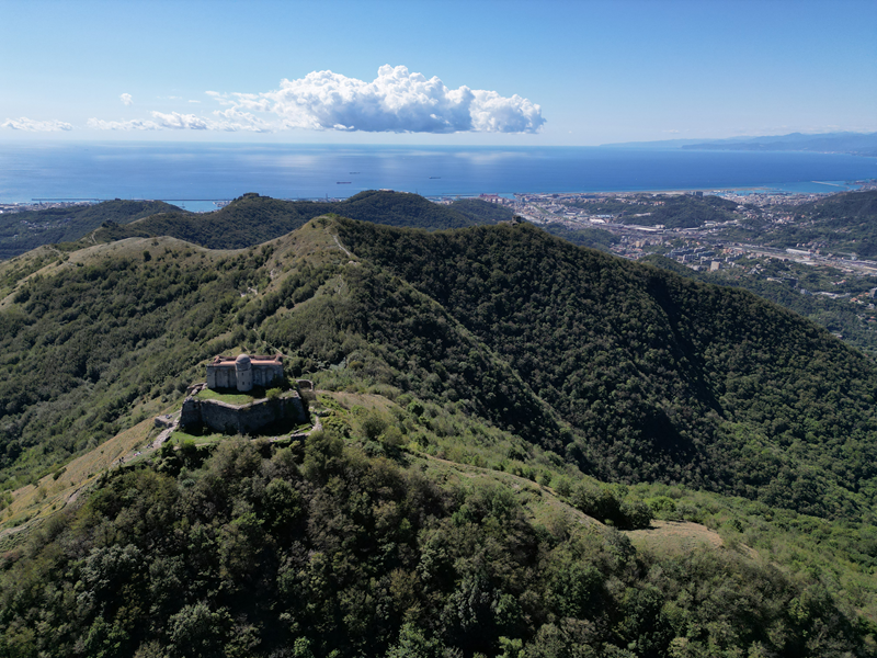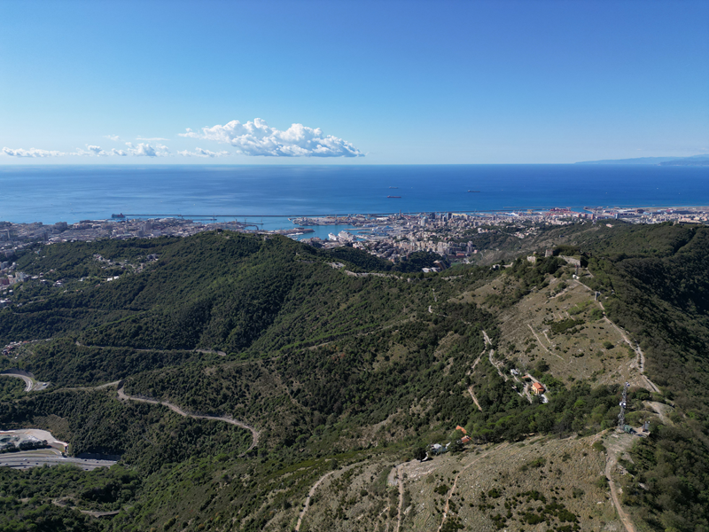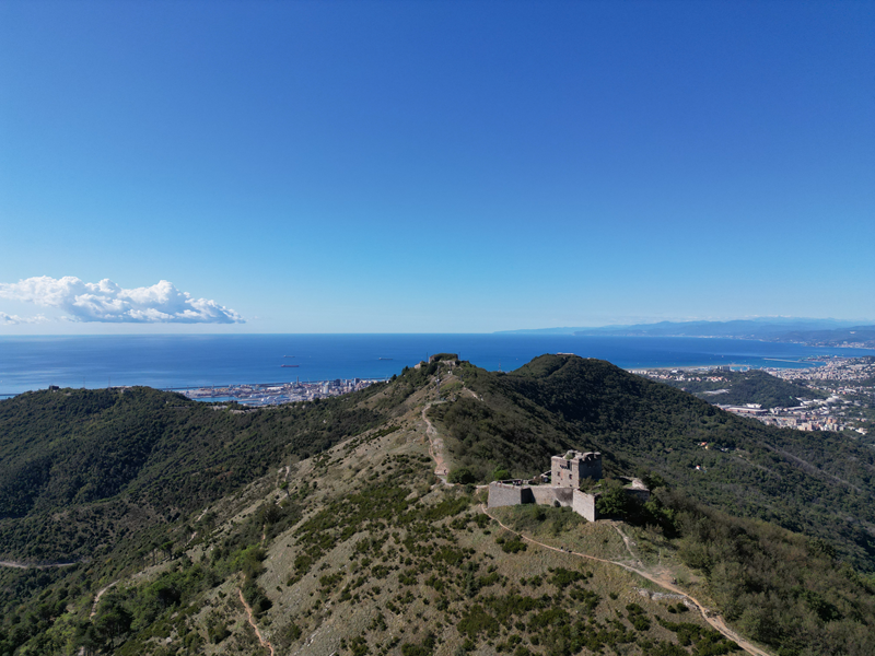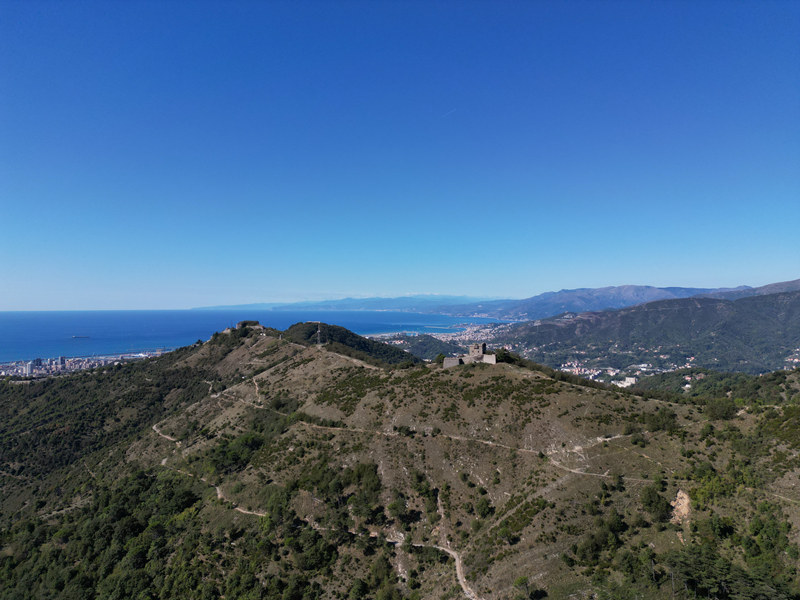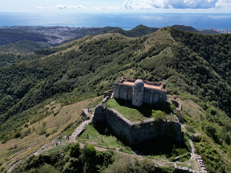 Si parte da via Piacenza, nel punti in cui dirama, verso monte, via Fossato Cicala (40 m circa). Dopo pochi metri di questa strada, all’altezza di un piccolo parco pubblico, si svolta a destra imboccando una lunga scalinata conosciuta come Salita della Liggia. Al culmine della rampa si incontra il sentiero dell’Acquedotto Storico di Genova che va semplicemente attraversato, continuando in salita fino ad incontrare, sulla sinistra, un ripido tracciato, cui si accede con una scaletta in pietra, che si inerpica nel bosco. In forte pendenza il sentiero (AQ1) dal fondo terroso guadagna quota, fino a pervenire alla cima boscosa del M.te Croce di Pinasco 263 m, ove il CAI-ULE di Genova ha sistemato una croce in ferro. Da questo punto l’itinerario procede su crinale che separa la valle del Bisagno a sinistra, da quella del Trensasco a destra. Alternando tratti in falsopiano a tratti assai ripidi il tracciato si sviluppa in una vegetazione arbustiva di ginestra, che di tanto in tanto lascia spazio a tratti boscosi con prevalenza di querce. Un ultima ripida salita mette su una strada sterrata che va attraversata, per proseguire in salita rientrando nel fitto della foresta, superando il Passo Gandino 445 m, ove sono i resti della teleferica che serviva la fortezza e raggiungendo il grande fossato di una Neviera, nella quale un tempo veniva stoccato il ghiaccio utile alla conservazione dei cibi (500 m circa). Di qui, con alcuni tratti ancora assai ripidi ci si porta ad un colletto, aperto tra la val Bisagno e la val Polcevera, posizionato appena al di sotto dell’incombente Forte Diamante. La struttura si raggiunge facilmente lungo una strada lastricata che, con molti tornanti e pendenze assai moderate, si porta in cima al Mte Diamante 672 m, ove essa è collocata (ore 2 dalla partenza).