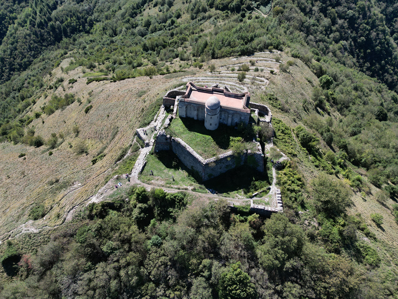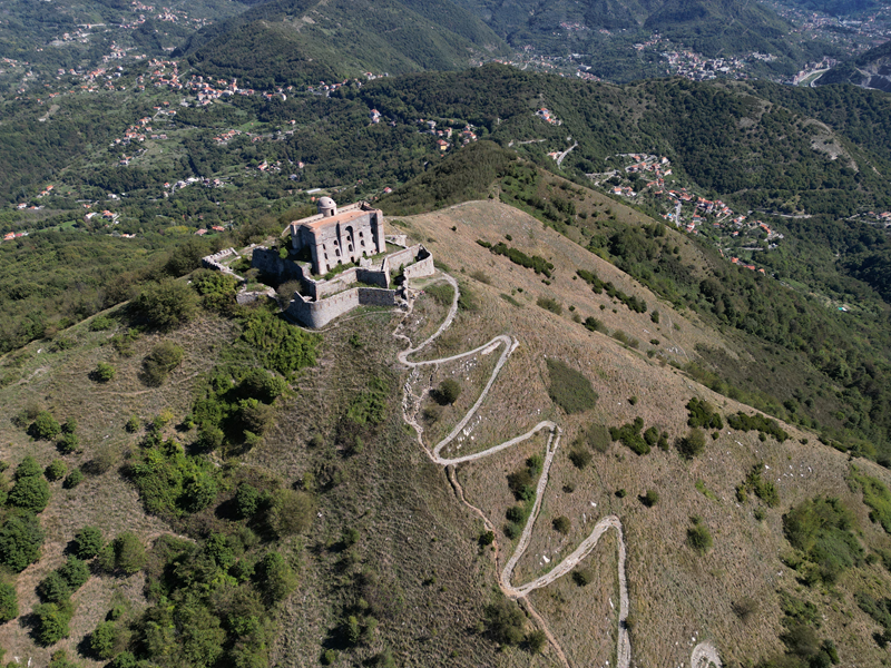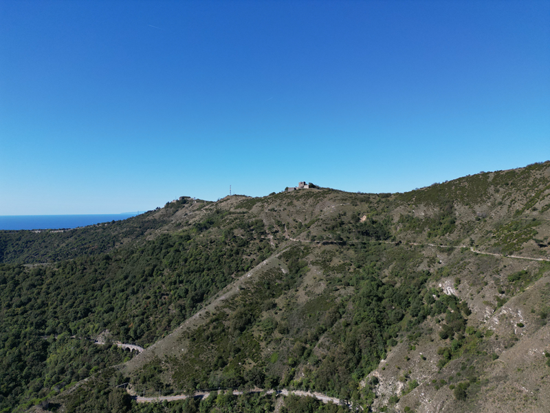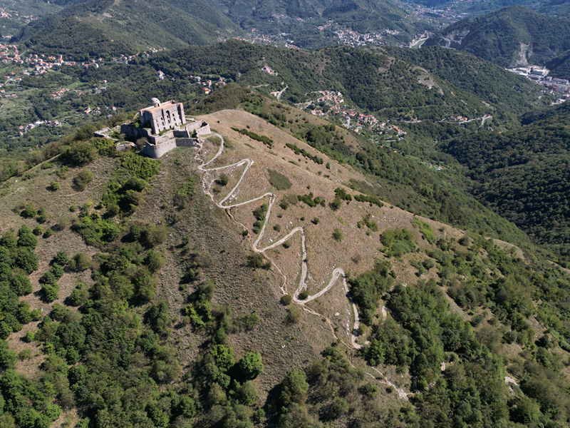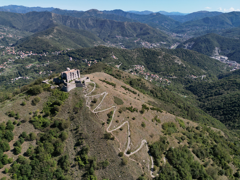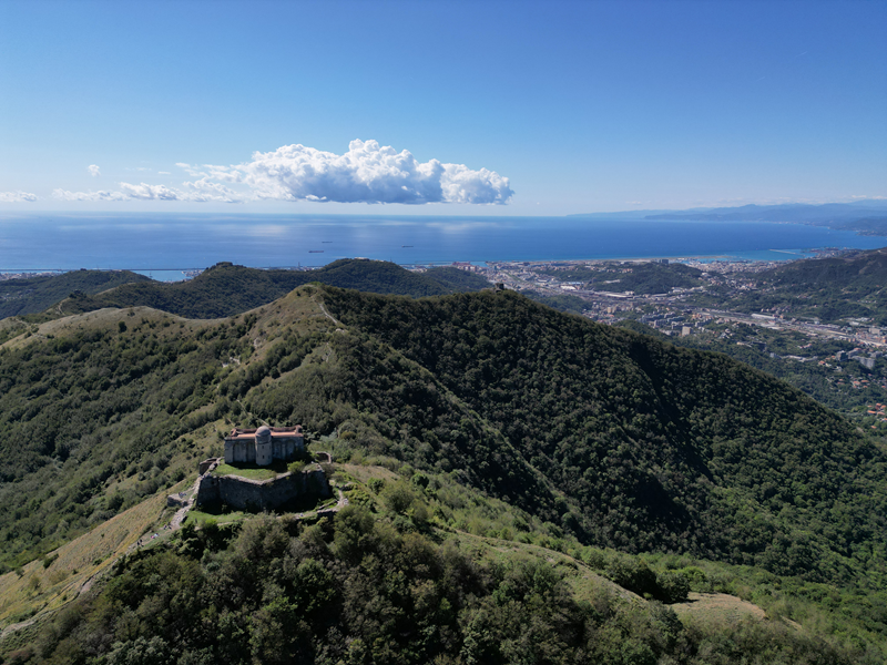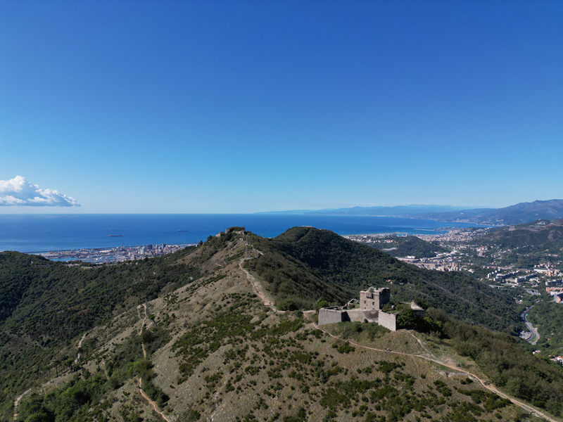 Si parte da via Piacenza, nel punti in cui dirama, verso monte, via Fossato Cicala (40 m circa). Dopo pochi metri di questa strada, all’altezza di un piccolo parco pubblico, si svolta a destra imboccando una lunga scalinata conosciuta come Salita della Liggia. Al culmine della rampa si incontra il sentiero dell’Acquedotto Storico di Genova che va semplicemente attraversato, continuando in salita fino ad incontrare, sulla sinistra, un ripido tracciato, cui si accede con una scaletta in pietra, che si inerpica nel bosco. In forte pendenza il sentiero (AQ1) dal fondo terroso guadagna quota, fino a pervenire alla cima boscosa del M.te Croce di Pinasco 263 m, ove il CAI-ULE di Genova ha sistemato una croce in ferro. Da questo punto l’itinerario procede su crinale che separa la valle del Bisagno a sinistra, da quella del Trensasco a destra. Alternando tratti in falsopiano a tratti assai ripidi il tracciato si sviluppa in una vegetazione arbustiva di ginestra, che di tanto in tanto lascia spazio a tratti boscosi con prevalenza di querce. Un ultima ripida salita mette su una strada sterrata che va attraversata, per proseguire in salita rientrando nel fitto della foresta, superando il Passo Gandino 445 m, ove sono i resti della teleferica che serviva la fortezza e raggiungendo il grande fossato di una Neviera, nella quale un tempo veniva stoccato il ghiaccio utile alla conservazione dei cibi (500 m circa). Di qui, con alcuni tratti ancora assai ripidi ci si porta ad un colletto, aperto tra la val Bisagno e la val Polcevera, posizionato appena al di sotto dell’incombente Forte Diamante. La struttura si raggiunge facilmente lungo una strada lastricata che, con molti tornanti e pendenze assai moderate, si porta in cima al Mte Diamante 672 m, ove essa è collocata (ore 2 dalla partenza).