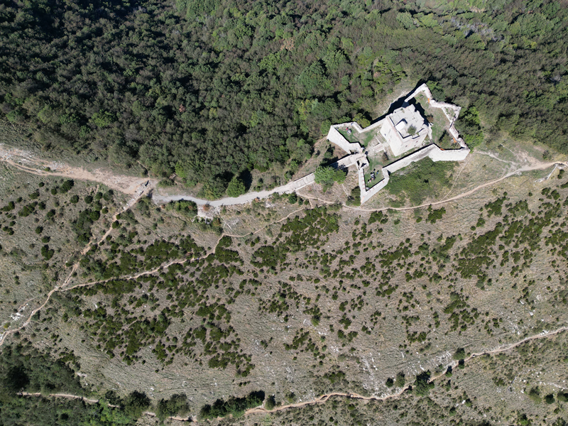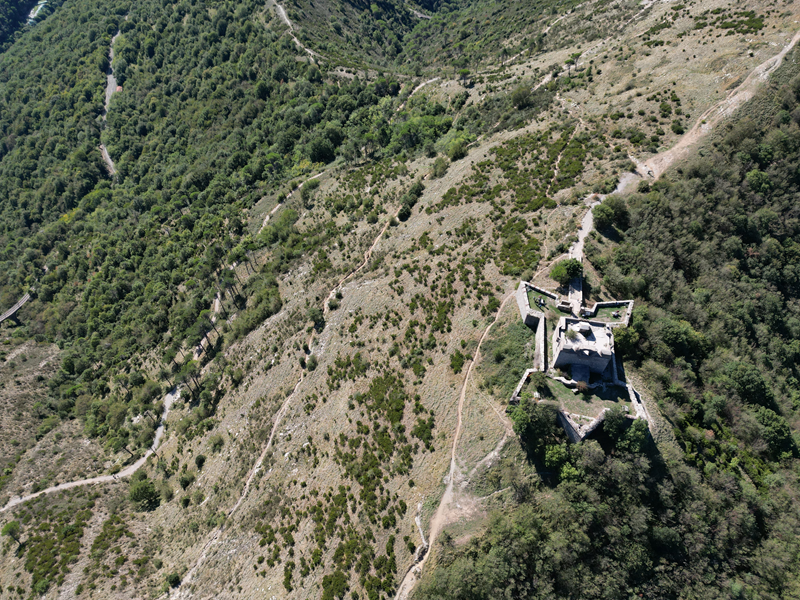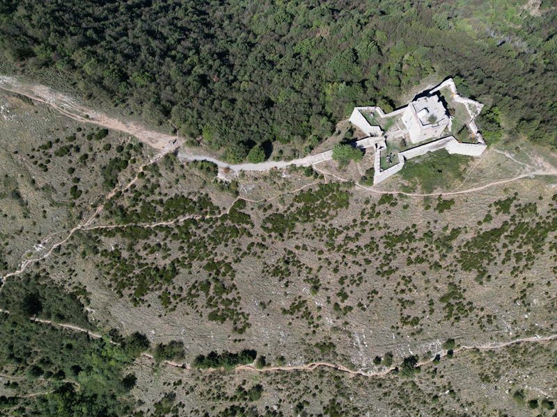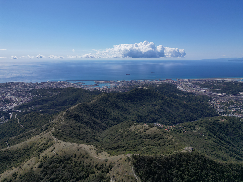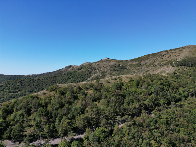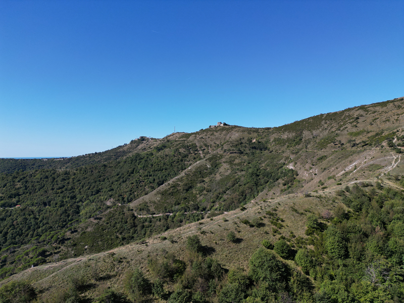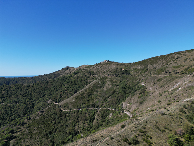 Passati sul fianco est della struttura, il suo lato minore che guarda verso il mare, si individua un sentiero discendente che, anch’esso su un crinale, perde ripidamente quota lungo un crinale erboso. Giunto nel bosco, il tracciato inanella alcuni tornanti, portandosi ad un piazzale-parcheggio presso cui si trova un bar-ristorante. Volgendo a destra, di qui, si intercetta la sterrata attraversata in precedenza, che va seguita per circa 30 min di cammino, fino ad incontrare il punto in cui, dopo una seconda neviera posta più in basso della precedente, a sinistra, dirama il sentiero utilizzato in salita.