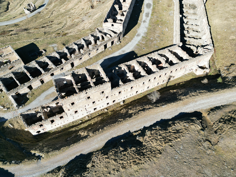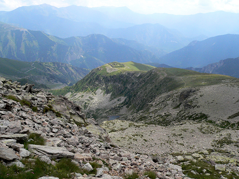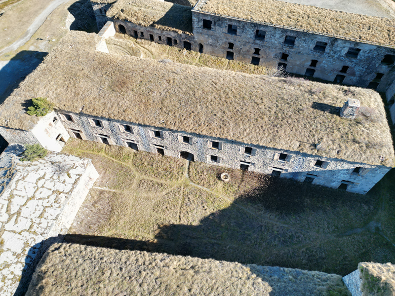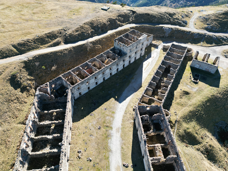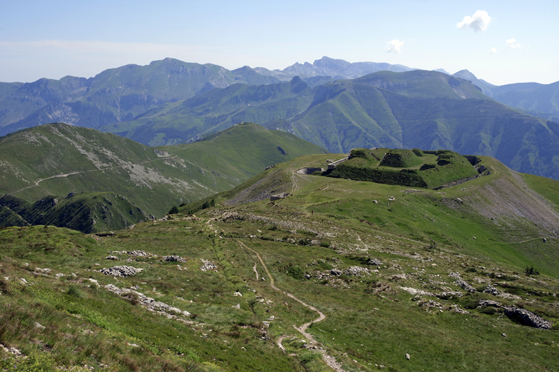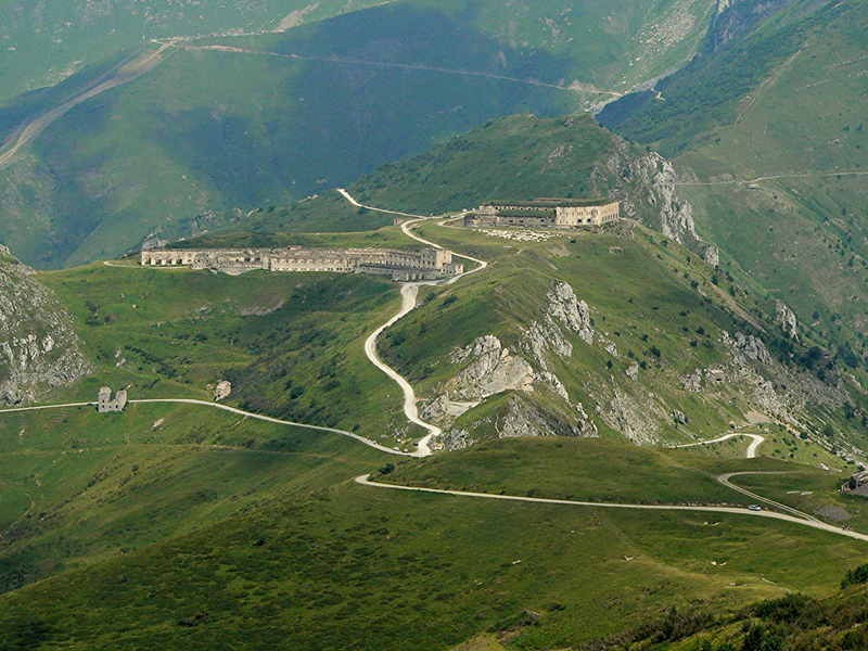 Dal parcheggio 1280 m si prosegue in salita lungo una strada asfaltata, che in circa 1.5 km porta ad uno spiazzo ove la rotabile volta a sinistra per attraversare un ponte e scendere a Limonetto per la sponda opposta del torrente. Qui a fianco di una cinta in legno di un’abitazione privata si imbocca un sentiero che, attraversato un corso d’acqua (bella cascata a destra) su un ponticello in legno, risale nella faggeta prendendo quota, fino a sbucare su una strada sterrata. Seguendo la carrareccia, si percorre un tornante, innalzandosi fino a raggiungere un bel pianoro erboso ove si viene a fiancheggiare un bar-ristorante e poco dopo, sempre seguendo la rotabile e dopo aver sottopassato uno skilift, un’abitazione privata. Qui a strada piega a destra e, trasformatasi in un tratturo erboso, confluisce nel tracciato L 14-GTA ed inizia a risalire il Vallone di S. Lorenzo, chiuso dal Colle di tenda e dalla sagoma del Forte Centrale. Dopo un lungo tratto sul fondo del vallone, in pendenza moderata, il tratturo piega a sinistra e, con alcuni tornanti, risale un costone erboso si porta al di sotto del Colle di Tenda e raggiunge lo chalet in legno di un bar-rifugio. Qui incontra la strada asfaltata che, risalendo da Limone, si porta al valico appena menzionato (1871 m) visibile sullo sfondo. Seguendo la strada verso il colle, ci si porta al di sotto del Forte Alto, ben evidente in alto sopra di noi, deviando poi decisamente, in presenza di una stradetta che sale a sinistra. Con alcuni tornanti il tracciato rimonta un costone erboso verso sinistra, portandosi all’ingresso ad arco della gigantesca Caserma difensiva del Forte Alto, in pessime condizioni di conservazione, che si attraversa seguendo una pista in terra battuta. All’uscita della caserma si risale brevemente un costoncino erboso sulla sinistra, per trovarsi sul vasto piazzale compreso tra la Caserma difensiva e il Forte Centrale (o Forte Alto) 1908 m (ore 2 complessive)