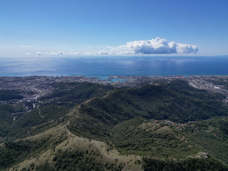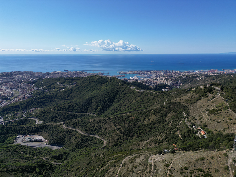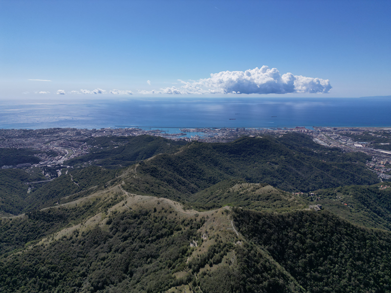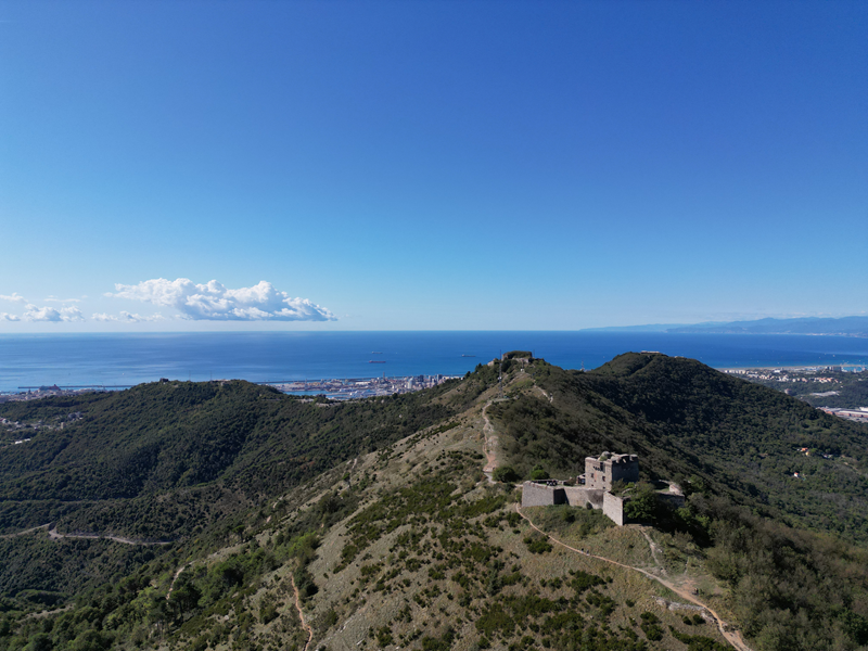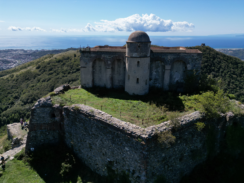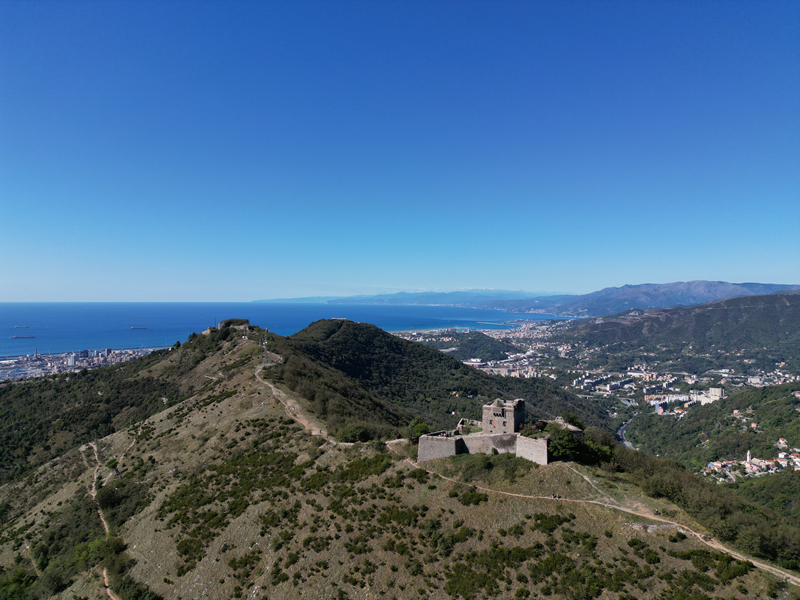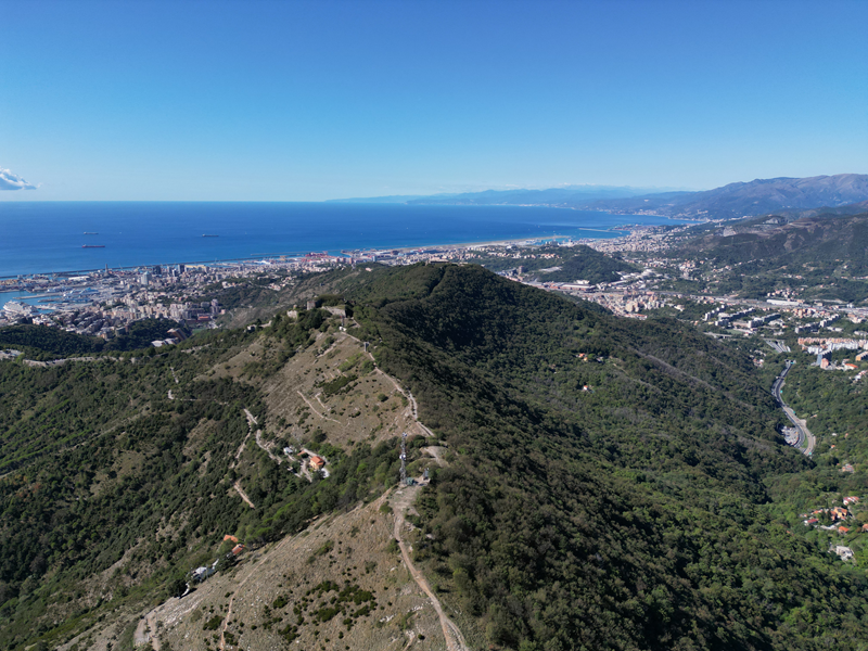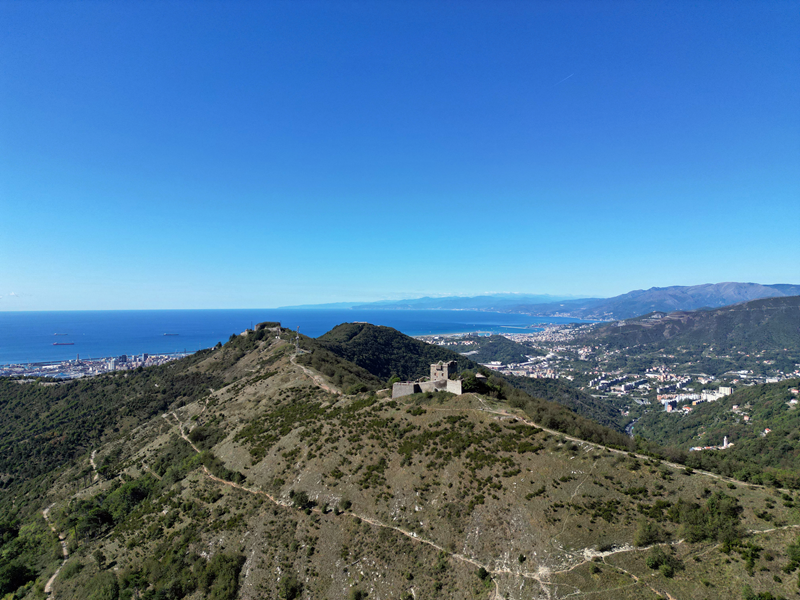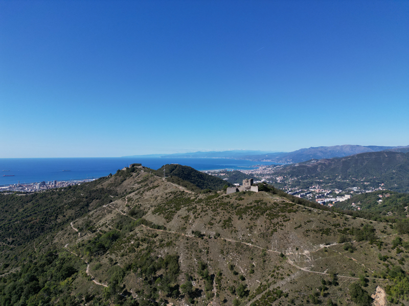Si parte da via Piacenza, nel punti in cui dirama, verso monte, via Fossato Cicala (40 m circa). Dopo pochi metri di questa strada, all’altezza di un piccolo parco pubblico, si svolta a destra imboccando una lunga scalinata conosciuta come Salita della Liggia. Al culmine della rampa si incontra il sentiero dell’Acquedotto Storico di Genova che va semplicemente attraversato, continuando in salita fino ad incontrare, sulla sinistra, un ripido tracciato, cui si accede con una scaletta in pietra, che si inerpica nel bosco. In forte pendenza il sentiero (AQ1) dal fondo terroso guadagna quota, fino a pervenire alla cima boscosa del M.te Croce di Pinasco 263 m, ove il CAI-ULE di Genova ha sistemato una croce in ferro. Da questo punto l’itinerario procede su crinale che separa la valle del Bisagno a sinistra, da quella del Trensasco a destra. Alternando tratti in falsopiano a tratti assai ripidi il tracciato si sviluppa in una vegetazione arbustiva di ginestra, che di tanto in tanto lascia spazio a tratti boscosi con prevalenza di querce. Un ultima ripida salita mette su una strada sterrata che va attraversata, per proseguire in salita rientrando nel fitto della foresta, superando il Passo Gandino 445 m, ove sono i resti della teleferica che serviva la fortezza e raggiungendo il grande fossato di una Neviera, nella quale un tempo veniva stoccato il ghiaccio utile alla conservazione dei cibi (500 m circa). Di qui, con alcuni tratti ancora assai ripidi ci si porta ad un colletto, aperto tra la val Bisagno e la val Polcevera, posizionato appena al di sotto dell’incombente Forte Diamante. La struttura si raggiunge facilmente lungo una strada lastricata che, con molti tornanti e pendenze assai moderate, si porta in cima al Mte Diamante 672 m, ove essa è collocata (ore 2 dalla partenza).