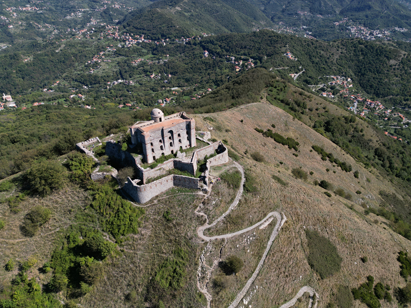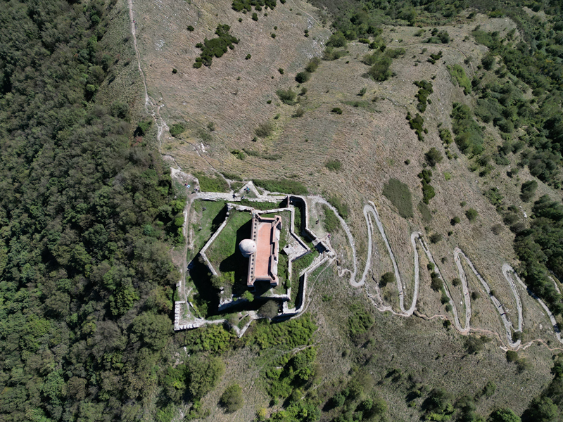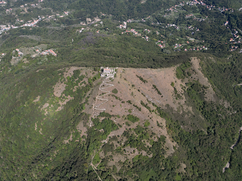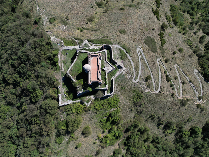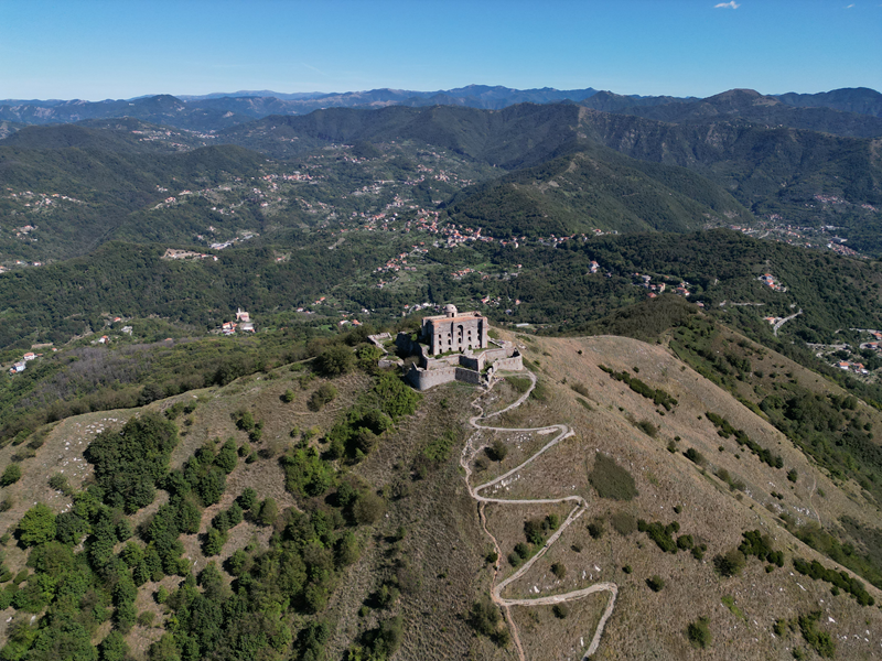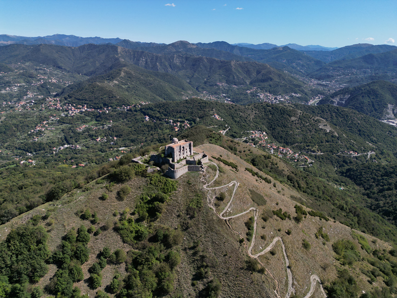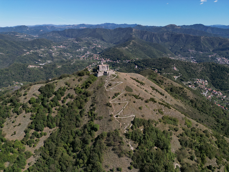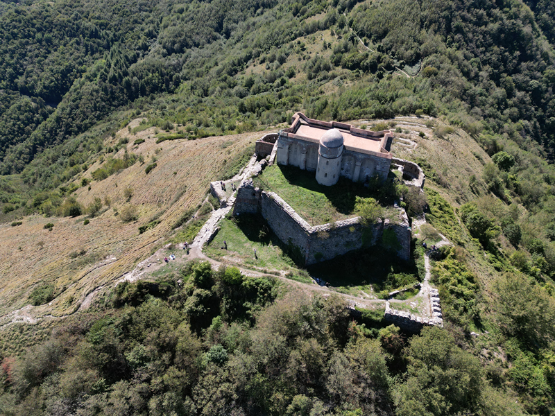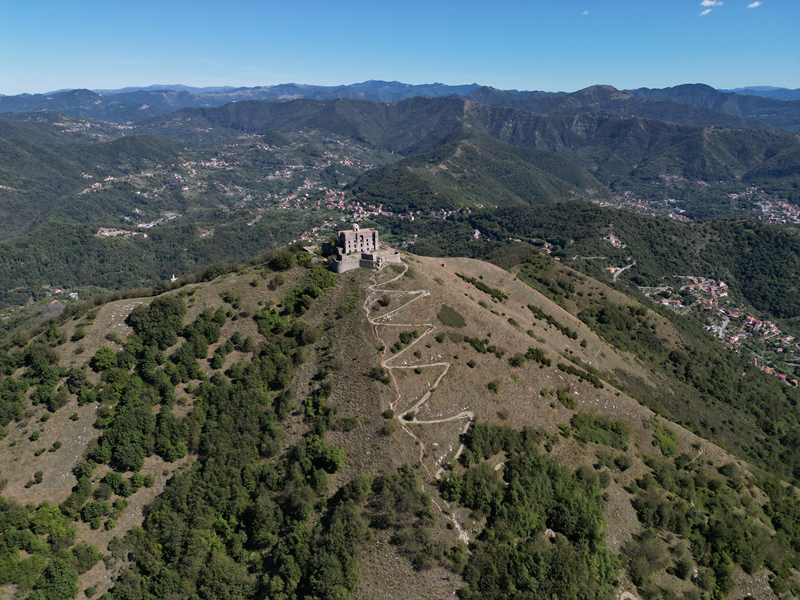 Si parte da via Piacenza, nel punti in cui dirama, verso monte, via Fossato Cicala (40 m circa). Dopo pochi metri di questa strada, all’altezza di un piccolo parco pubblico, si svolta a destra imboccando una lunga scalinata conosciuta come Salita della Liggia. Al culmine della rampa si incontra il sentiero dell’Acquedotto Storico di Genova che va semplicemente attraversato, continuando in salita fino ad incontrare, sulla sinistra, un ripido tracciato, cui si accede con una scaletta in pietra, che si inerpica nel bosco. In forte pendenza il sentiero (AQ1) dal fondo terroso guadagna quota, fino a pervenire alla cima boscosa del M.te Croce di Pinasco 263 m, ove il CAI-ULE di Genova ha sistemato una croce in ferro. Da questo punto l’itinerario procede su crinale che separa la valle del Bisagno a sinistra, da quella del Trensasco a destra. Alternando tratti in falsopiano a tratti assai ripidi il tracciato si sviluppa in una vegetazione arbustiva di ginestra, che di tanto in tanto lascia spazio a tratti boscosi con prevalenza di querce. Un ultima ripida salita mette su una strada sterrata che va attraversata, per proseguire in salita rientrando nel fitto della foresta, superando il Passo Gandino 445 m, ove sono i resti della teleferica che serviva la fortezza e raggiungendo il grande fossato di una Neviera, nella quale un tempo veniva stoccato il ghiaccio utile alla conservazione dei cibi (500 m circa). Di qui, con alcuni tratti ancora assai ripidi ci si porta ad un colletto, aperto tra la val Bisagno e la val Polcevera, posizionato appena al di sotto dell’incombente Forte Diamante. La struttura si raggiunge facilmente lungo una strada lastricata che, con molti tornanti e pendenze assai moderate, si porta in cima al Mte Diamante 672 m, ove essa è collocata (ore 2 dalla partenza).
