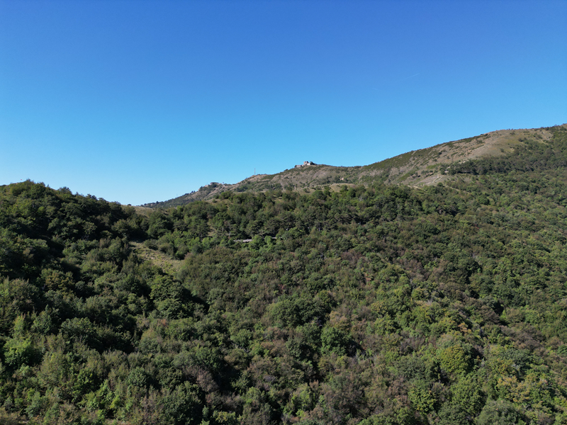 Passati sul fianco est della struttura, il suo lato minore che guarda verso il mare, si individua un sentiero discendente che, anch’esso su un crinale, perde ripidamente quota lungo un crinale erboso. Giunto nel bosco, il tracciato inanella alcuni tornanti, portandosi ad un piazzale-parcheggio presso cui si trova un bar-ristorante. Volgendo a destra, di qui, si intercetta la sterrata attraversata in precedenza, che va seguita per circa 30 min di cammino, fino ad incontrare il punto in cui, dopo una seconda neviera posta più in basso della precedente, a sinistra, dirama il sentiero utilizzato in salita.