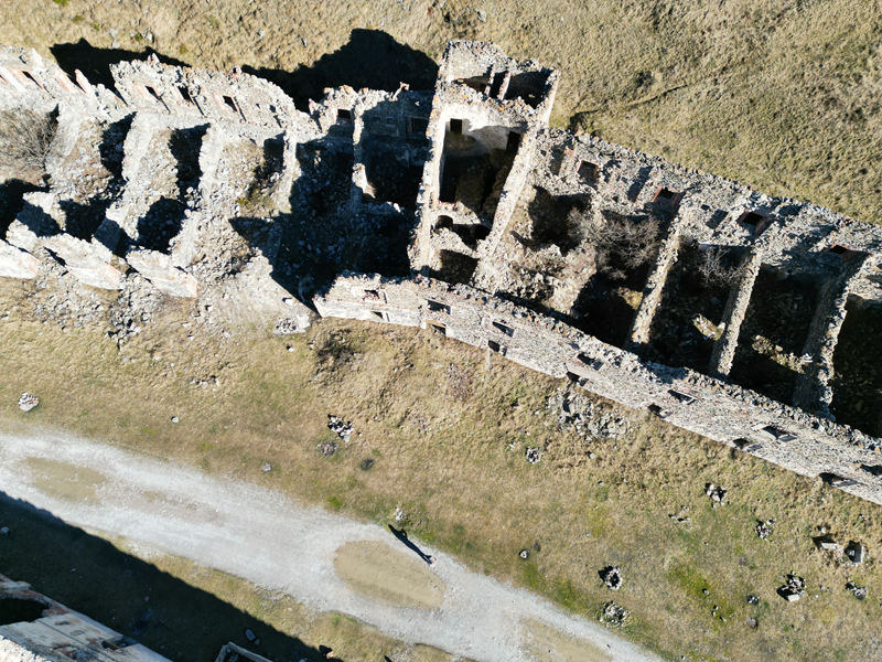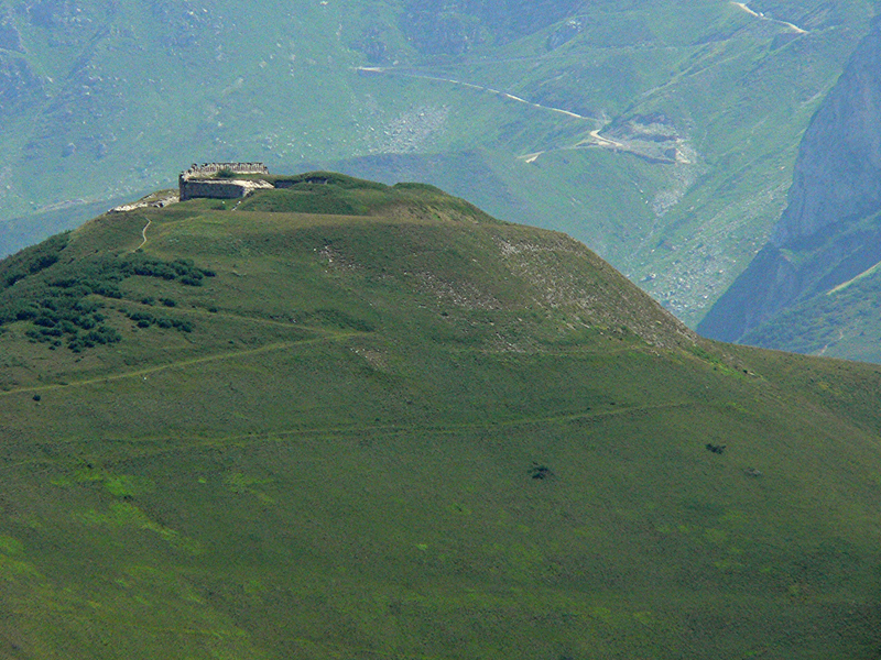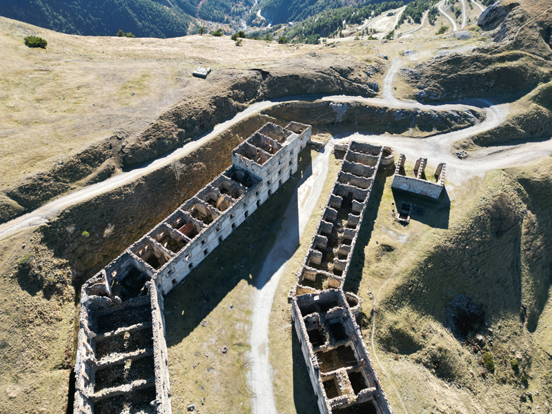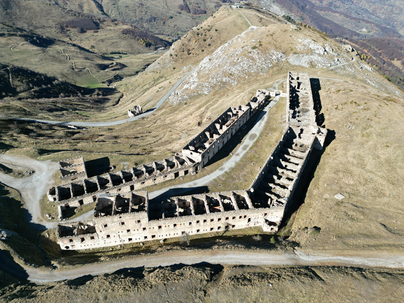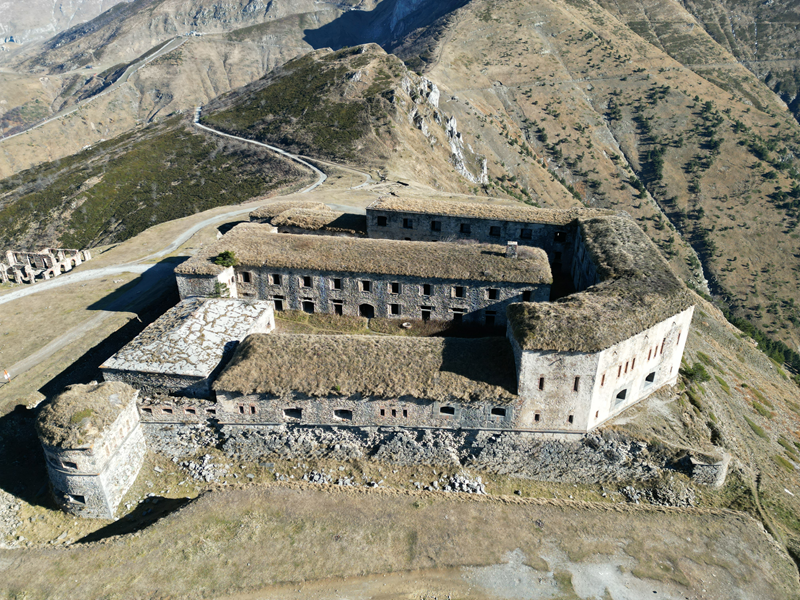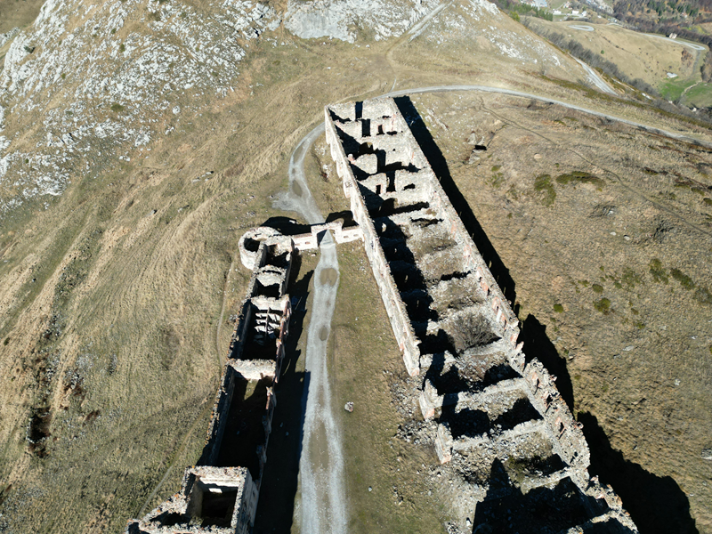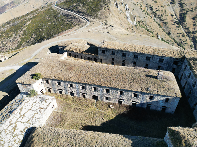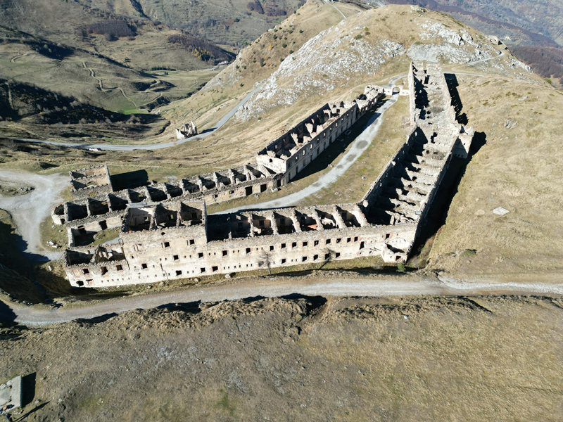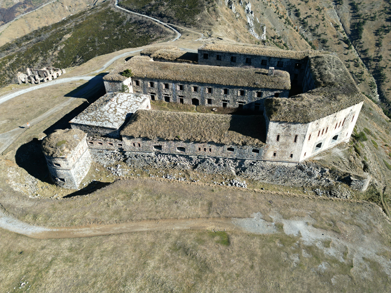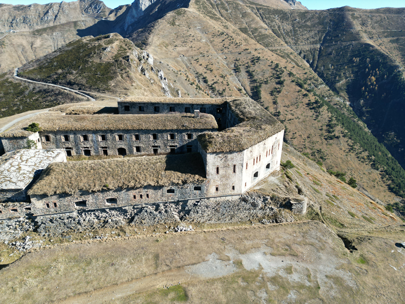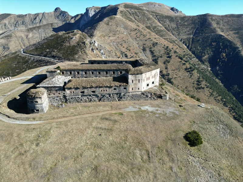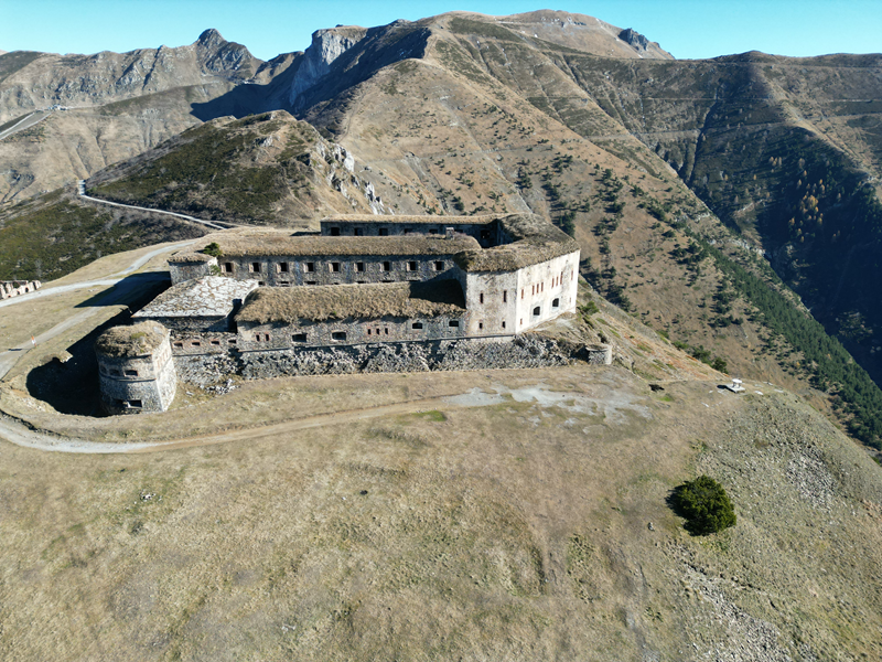 Dal parcheggio 1280 m si prosegue in salita lungo una strada asfaltata, che in circa 1.5 km porta ad uno spiazzo ove la rotabile volta a sinistra per attraversare un ponte e scendere a Limonetto per la sponda opposta del torrente. Qui a fianco di una cinta in legno di un’abitazione privata si imbocca un sentiero che, attraversato un corso d’acqua (bella cascata a destra) su un ponticello in legno, risale nella faggeta prendendo quota, fino a sbucare su una strada sterrata. Seguendo la carrareccia, si percorre un tornante, innalzandosi fino a raggiungere un bel pianoro erboso ove si viene a fiancheggiare un bar-ristorante e poco dopo, sempre seguendo la rotabile e dopo aver sottopassato uno skilift, un’abitazione privata. Qui a strada piega a destra e, trasformatasi in un tratturo erboso, confluisce nel tracciato L 14-GTA ed inizia a risalire il Vallone di S. Lorenzo, chiuso dal Colle di tenda e dalla sagoma del Forte Centrale. Dopo un lungo tratto sul fondo del vallone, in pendenza moderata, il tratturo piega a sinistra e, con alcuni tornanti, risale un costone erboso si porta al di sotto del Colle di Tenda e raggiunge lo chalet in legno di un bar-rifugio. Qui incontra la strada asfaltata che, risalendo da Limone, si porta al valico appena menzionato (1871 m) visibile sullo sfondo. Seguendo la strada verso il colle, ci si porta al di sotto del Forte Alto, ben evidente in alto sopra di noi, deviando poi decisamente, in presenza di una stradetta che sale a sinistra. Con alcuni tornanti il tracciato rimonta un costone erboso verso sinistra, portandosi all’ingresso ad arco della gigantesca Caserma difensiva del Forte Alto, in pessime condizioni di conservazione, che si attraversa seguendo una pista in terra battuta. All’uscita della caserma si risale brevemente un costoncino erboso sulla sinistra, per trovarsi sul vasto piazzale compreso tra la Caserma difensiva e il Forte Centrale (o Forte Alto) 1908 m (ore 2 complessive)
