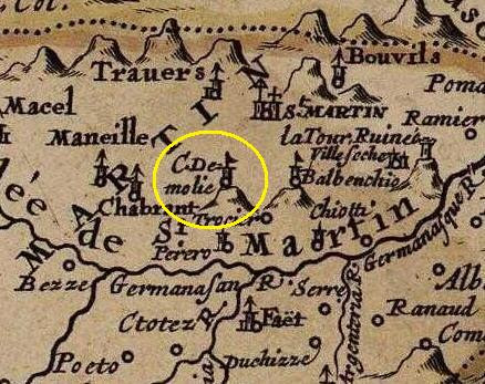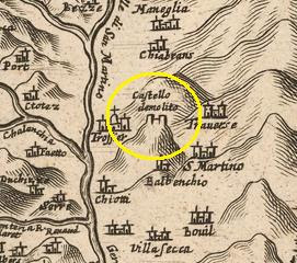 A sinistra, uno stralcio della "Carta delle Valli del Piemonte abitate dai Valdesi ossia Protestanti", incisa a Parigi nel 1690 di Jean-Baptiste Nolin, nella quale viene indicato il "C.(astello) Demolie" di Perrero. A destra, la "Carta delle Tre Valli del Piemonte" del 1668 in cui viene nuovamente indicato come il "Castello demolito".