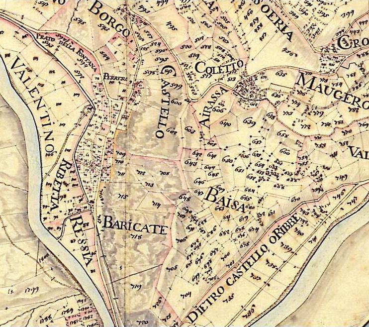 A sinistra, la "Carta topografica delle valli di Pragelà, S. Martino, Perosa, e Lucerna" di metà ‘700 riporta ancora l'indicazione del castello di Perrero. A destra, una mappa catastale di fine '700 in cui si vedono alcuni toponimi come "Baricate" e Castello".