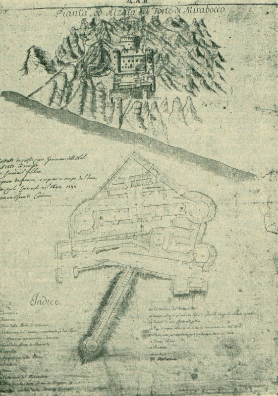 Per il rifornimento idrico, pare che il forte fosse collegato al fiume attraverso una scalinata coperta, mentre all’interno delle mura erano presenti gli alloggiamenti, una cappella e le prigioni ed all’esterno si rinvenivano il cimitero ed alcuni baraccamenti. In realtà, il collegamento al fiume attraverso una scalinata coperta è desunto dal Pons sulla base di taluni disegni. D’altra parte, vista anche la pendenza dello strapiombo roccioso, pare più verosimile che il collegamento scalinato si riferisse ad una cisterna interna al forte, fatta realizzare e modificare più volte nel corso degli anni, come ben illustra Giorgio Ponzio in un suo studio. Qui, infatti, vengono menzionati documenti da cui più volte risultano esservi stati finanziamenti e/o opere di manutenzione inerenti la cisterna del forte e addirittura, nonostante i vari disegni raffigurassero una sorta di acquedotto, Ponzio ha brillantemente concluso, attraverso l’analisi della documentazione d’archivio, che soltanto nel 1680 vi fu l’assegnazione dei lavori per la realizzazione di un pozzo. Tale pozzo, fece sì che “dopo un non realizzato progetto d’acquedotto, attraverso l’uso provvisorio di una cisterna, a 111 anni dal probabile inizio dei lavori di costruzione e ad 88 anni dal primo progetto del Soldati, finalmente il Mirabocco poteva disporre di un sicuro rifornimento d’acqua.”