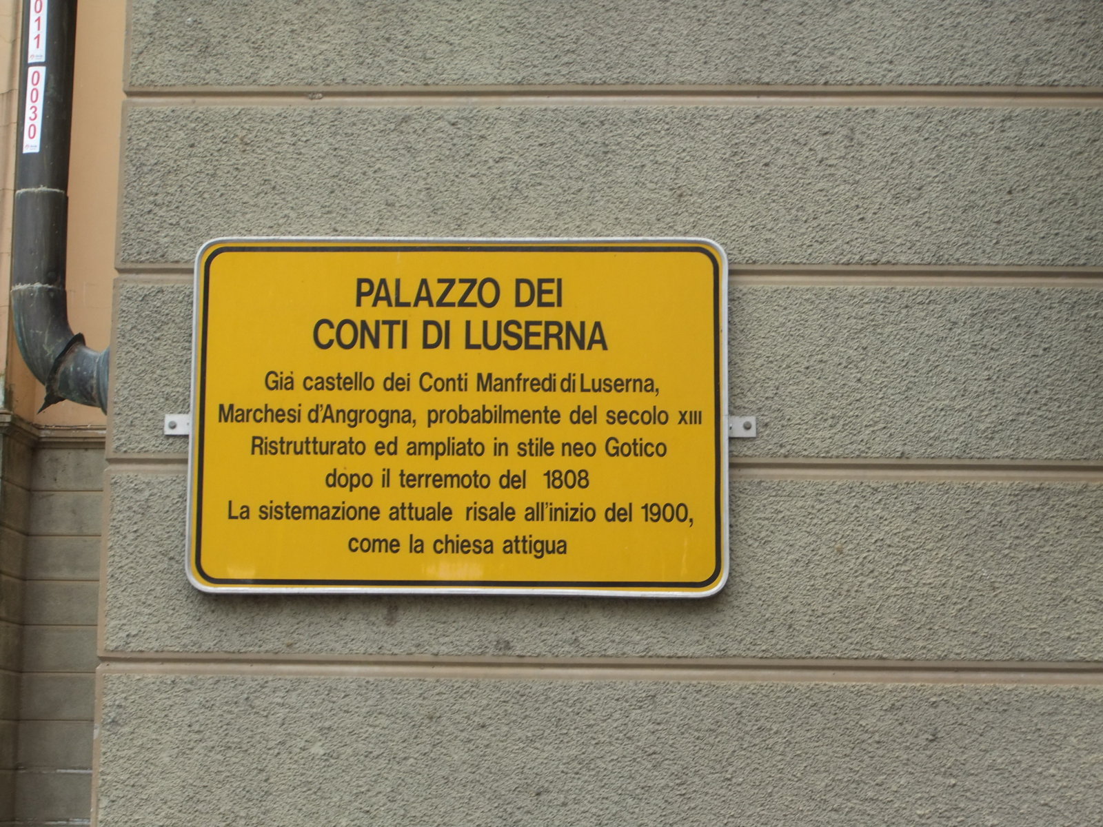 Il Palazzo dei Manfredi, dove nacquero, vissero, morirono e soprattutto comandarono i Conti di Luserna a partire dal ‘300 e sino alle ultime discendenti della casata, si trova sul lato destro della piazza parrocchiale di S. Giacomo, in frazione Luserna Alta. L’attuale struttura, tuttavia, risale ai primi anni del'800, non rimanendo pressoché nulla della precedente costruzione trecentesca, rasa al suolo, insieme alla chiesa parrocchiale, dal terremoto che nel 1808 sconvolse la zona.