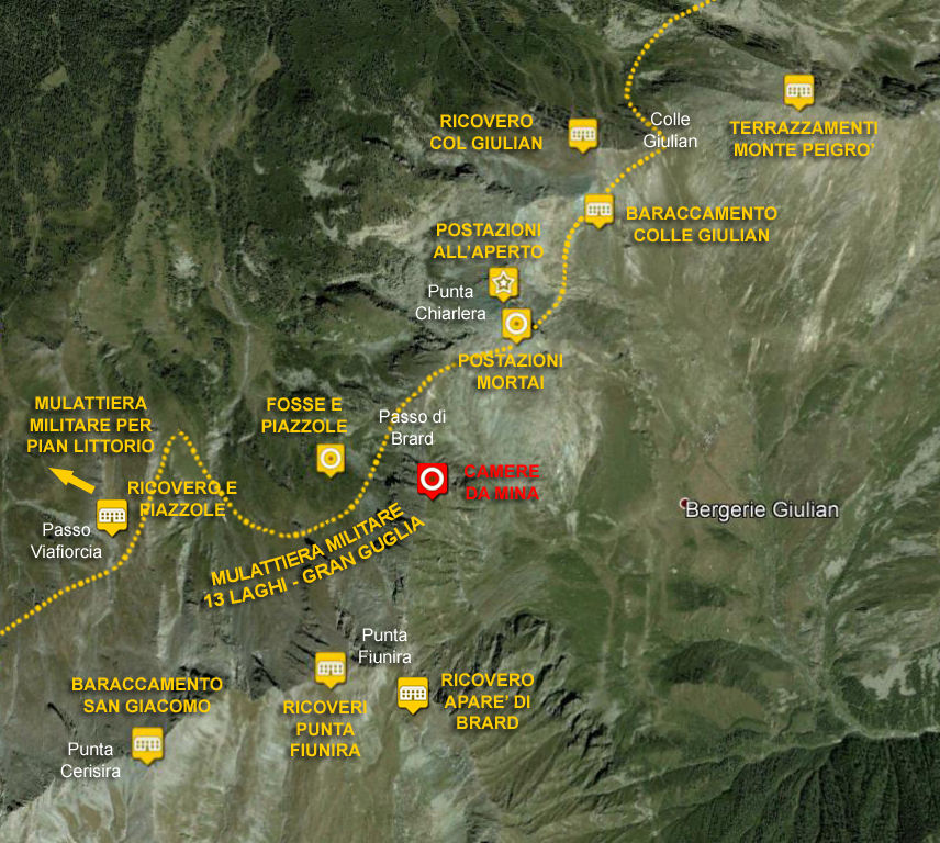L’esercito italiano, per agevolare gli spostamenti di uomini e mezzi, aveva realizzato tra fine ‘800 e inizio ‘900 una lunghissima mulattiera, ancora oggi perfettamente percorribile, che parte dal ricovero di Rocca Bianca, a monte delle cave di marmo, e prosegue a mezza costa, con un percorso praticamente pianeggiante, passando vicino al lago d’Envie e arrivando alla conca dei Tredici Laghi. Da qui poi, attraverso numerosi valichi, la mulattiera percorre in quota tutta la cresta spartiacque tra l’alta Val Germanasca (Prali) e la Val Pellice (Bobbio Pellice), fino ad arrivare al Passo della Gran Guglia e al Caposaldo Abries.