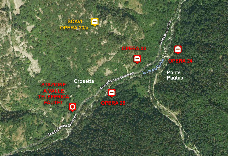 Dall’opera 25 si potrà agevolmente scendere il versante vallivo verso il torrente e verso la strada che sale al Rifugio Barbara, che si troverà in pochi minuti dopo aver guadato il torrente ed aggirato una piccola centrale elettrica. Giunti sulla strada, prima di tornare verso l’autovettura, si prosegue in salita ancora per qualche centinaio di metri, sino a rinvenire, sulla destra, una diramazione circolare che raggiunge la stazione di partenza della teleferica che raggiungeva il Colle del Fautet, dove era posizionata la 150° batteria G.a.F.. La struttura è ancora agevolmente espressiva della funzione cui era destinata, essendo visibile il blocco in calcestruzzo cui era ancorata la teleferica ed il vasto deposito materiali, nonché la rampa di partenza, collegati da un piano inclinato in cemento, costruito per facilitare il trasporto del materiale. Date le condizioni precarie del tetto, non è consigliabile l’accesso all’interno.