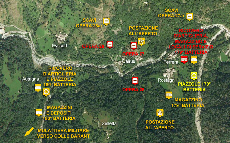 Nel 1940, per dare maggiore robustezza alla linea difensiva, vennero previste tre nuove opere tipo 15000, la 26/a, la 27/a e la 28/a, pensate per resistere ai medi calibri. Della prima, che avrebbe dovuto sorgere a sud-est dell'opera 26, non sono state trovate tracce; l’unica struttura individuata è una postazione di osservazione vicino alla loc. Ciappelet, dalla quale si domina tutto la zona del caposaldo. Per raggiungere l’opera 28/a occorre invece salire dal lato opposto della valle, prendendo lungo la strada provinciale il bivio a destra che conduce alla borgata Eyssart, e poi proseguendo lungo un evidente e ripido sentiero alle spalle delle case, fino a giungere su un versante da cui si dominano sia l’alta che la bassa valle. Qui si trovano gli scavi dell’opera 28/a: si possono esplorare due vaste gallerie scavate nella roccia viva, posizionate a quote diverse e individuabili dall’esterno grazie ai cumuli di materiale estratto posto agli imbocchi (uno dei quali è chiuso da un muro in pietra). Lungo le gallerie si aprono i ripidi cunicoli che davano accesso alle postazioni di tiro. Poco più a valle, sul versante di fronte alla borgata Rostagni, immersi nella vegetazione (e pertanto difficilmente raggiungibili) si trovano gli scavi dell’opera 27/a, sostanzialmente simili ai precedenti. I lavori di scavo per queste due opere iniziarono nel giugno del 1940 e risultarono praticamente ultimati nell’ottobre dello stesso anno. Nel corso del 1941 non vennero però eseguiti ulteriori lavori (rivestimenti, gettate, arredi, ecc.), perché l’amministrazione militare era indecisa sulle modifiche da apportare alle strutture. L’opera 27/a prevedeva due mitragliatrici e avrebbe dovuto essere sede del comando del caposaldo, mentre la dotazione della 28/a era di tre mitragliatrici.