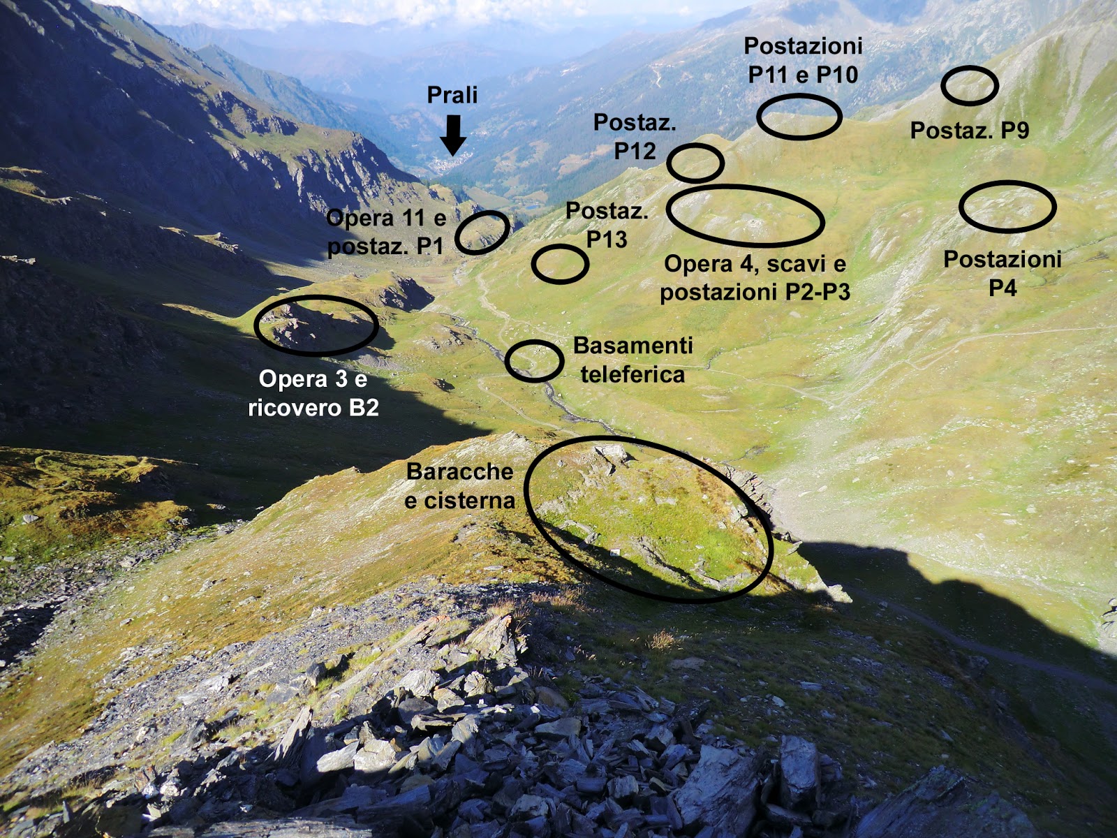 Nella piccola conca a nord-est dell’“Arsenale”, più arretrata rispetto al confine, si trovano numerosi terrazzamenti e piazzole, posti in un pianoro riparato: qui una carta del 1939 individuava la presenza di una batteria di due mortai da 81. Sulle alture circostanti a nord vi sono alcuni appostamenti all’aperto (P15, P16), composti da semplici avvallamenti nel terreno protetti da muretti a secco; leggermente più a est, sulla cresta che sovrasta la zona di Pian Littorio si trova invece un grande scavo circolare destinato all’opera 9. Ma le strutture più interessanti sono una serie di postazioni coperte, dotate di feritoie e collegate tra loro da un trinceramento anch’esso coperto, con il compito di battere la strada che scende verso il fondovalle. La copertura era sorretta da travi in ferro e legno e poi rivestita di terra, mentre le murature erano realizzate con pietre e sacchi di cemento. Una delle postazioni è ancora completamente integra e accessibile, compreso il basamento per mitragliatrice, mentre le altre e la trincea sono quasi interamente crollate. In questa zona, secondo i progetti dei militari, sarebbe dovuta sorgere l’opera 10: è possibile che si sia deciso di sostituire il bunker con queste strutture, decisamente più semplici ed economiche.