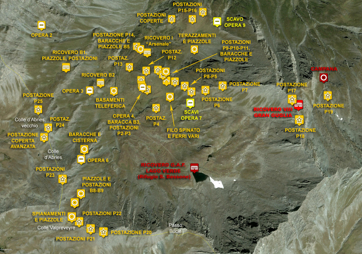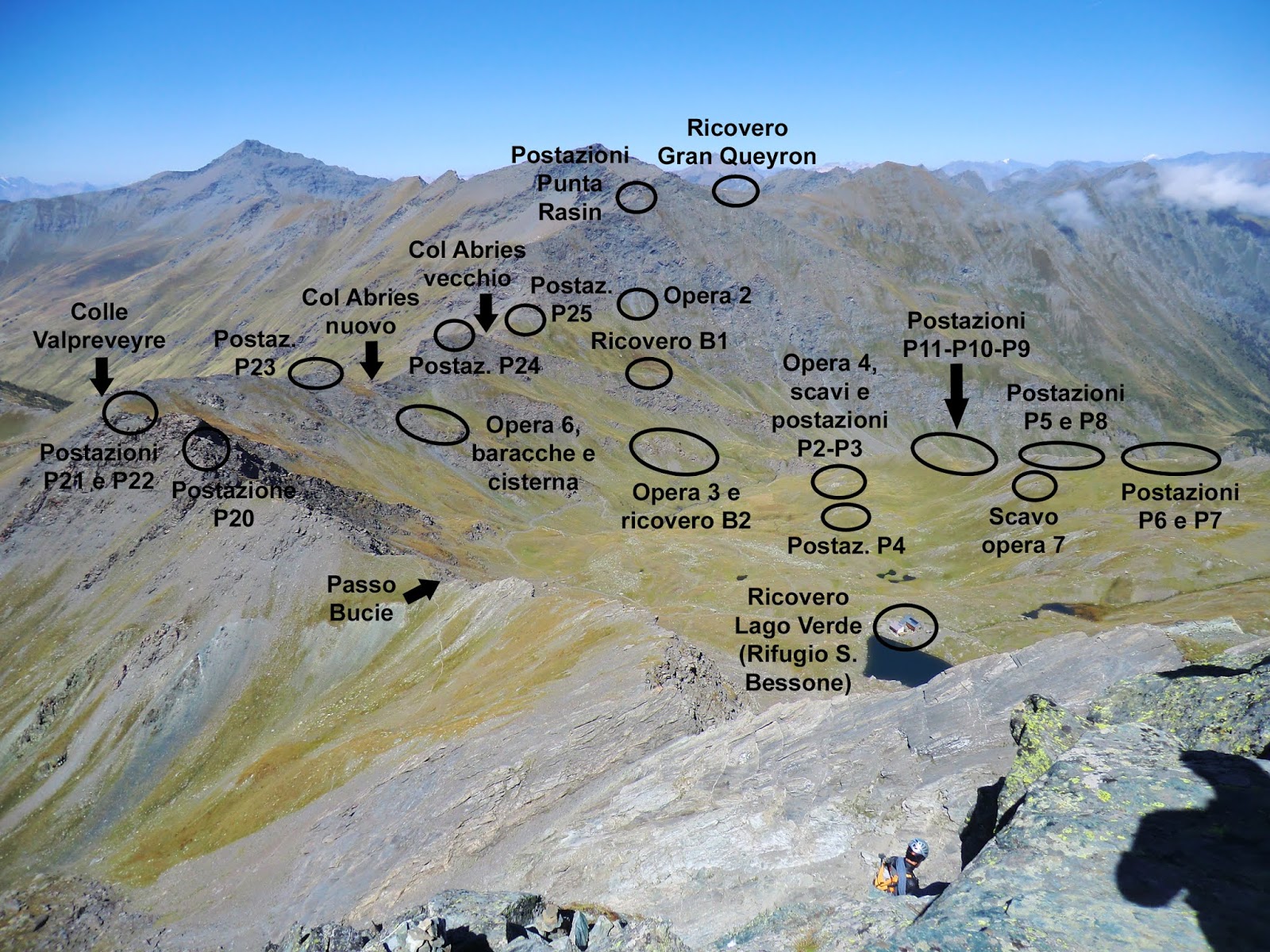 Tutto il crinale a nord del rifugio che, scendendo a ovest della Gran Guglia, “racchiude” la conca del Lago Verde, è letteralmente costellato di postazioni allo scoperto (ce ne sono almeno nove), realizzate con semplici muretti a secco, oltre ad alcune piazzole e resti di baracche situate in posizioni riparate in avvallamenti dietro il versante. Si tratta di appostamenti che disponevano di un’ottima visuale e campo di tiro aperto su eventuali truppe che avessero cercato di oltrepassare il confine. Alcune (come la P7 e la P5) sono più strutturate, con muraglie e feritoie per le armi, altre sono semplici ripari sul terreno, schermati da un po’ di pietre sovrapposte alla bell’e meglio. Poco al di sotto della postazione P5, si rinviene anche un cumulo di detriti derivanti dagli scavi per l’opera 7, iniziata nel 1939 ma mai completata. Nessuna traccia si è invece rilevata dell’opera 8, che avrebbe dovuto sorgere alle pendici ovest della Gran Guglia, i cui scavi venivano indicati come “iniziati” nel 1940; così come dell’opera 5, anch’essa teoricamente già in costruzione lungo il sentiero per il Colle d’Abries, tra le opere 3 e 6.