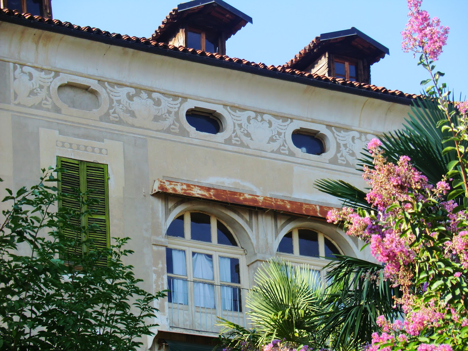 Il prospetto principale è contraddistinto da un ingresso pedonale con cornice in pietra che sorregge due colonnine ed è scandito dalla sequenza delle finestre del primo piano, decorate alternativamente da cornici semplici e a timpano. Il prospetto posteriore si affaccia sul giardino ed ha un profilo disomogeneo; l'estremità est, più curata, è costituita da una terrazza con portico al piano terra, un loggiato chiuso al primo piano con affresco raffigurante lo stemma del casato e un sottotetto illuminato da finestrelle polilobate inserite in una cornice decorativa bicroma.